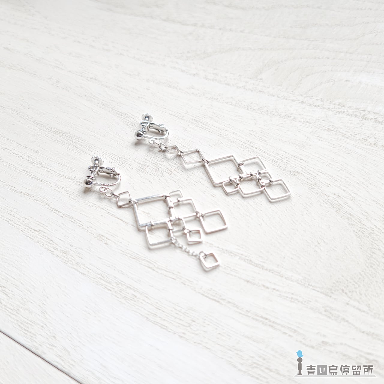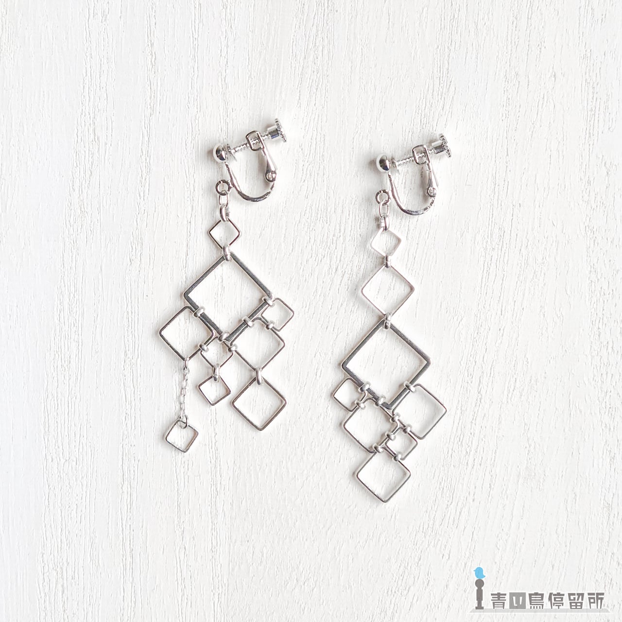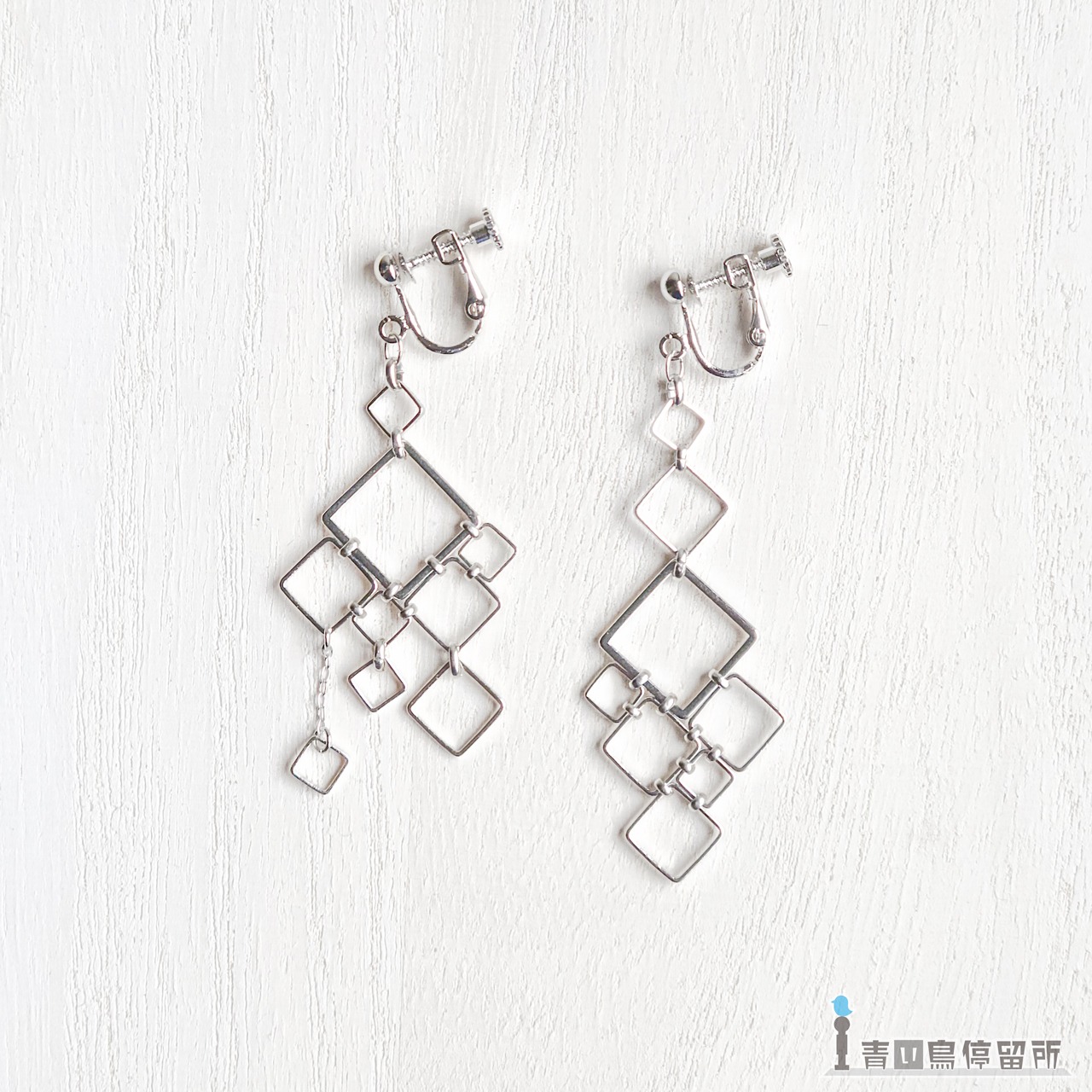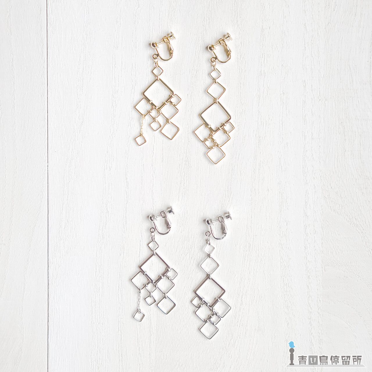 ゆらゆら揺れる大小様々な四角形が形作る、幾何学文様のイヤリングです。