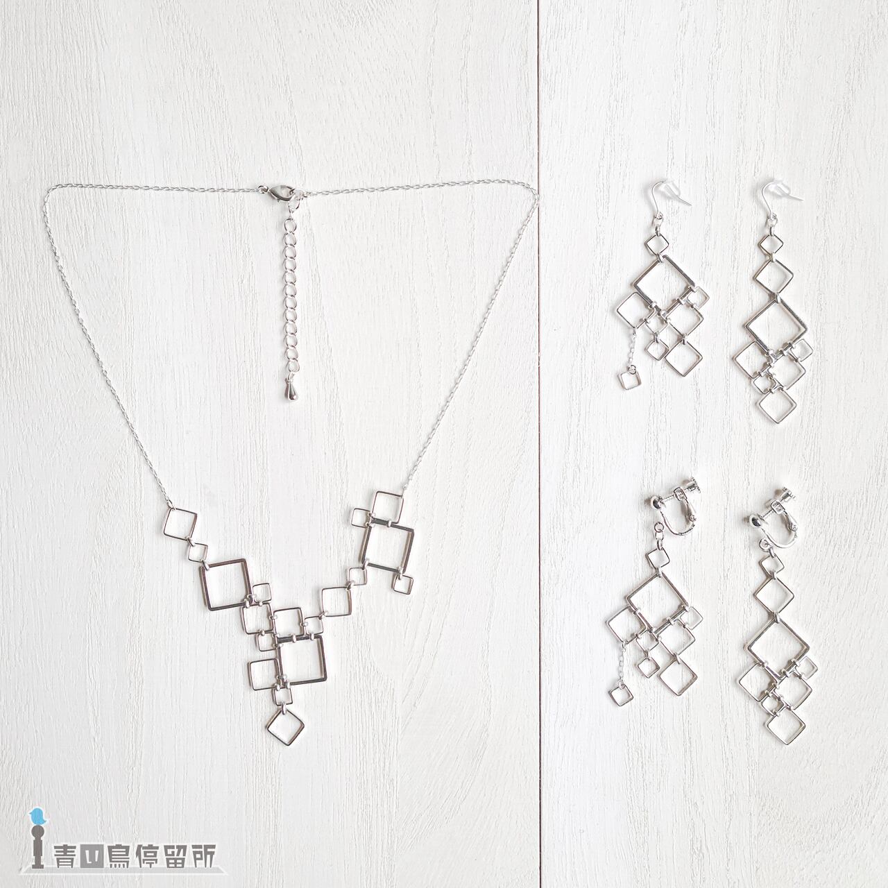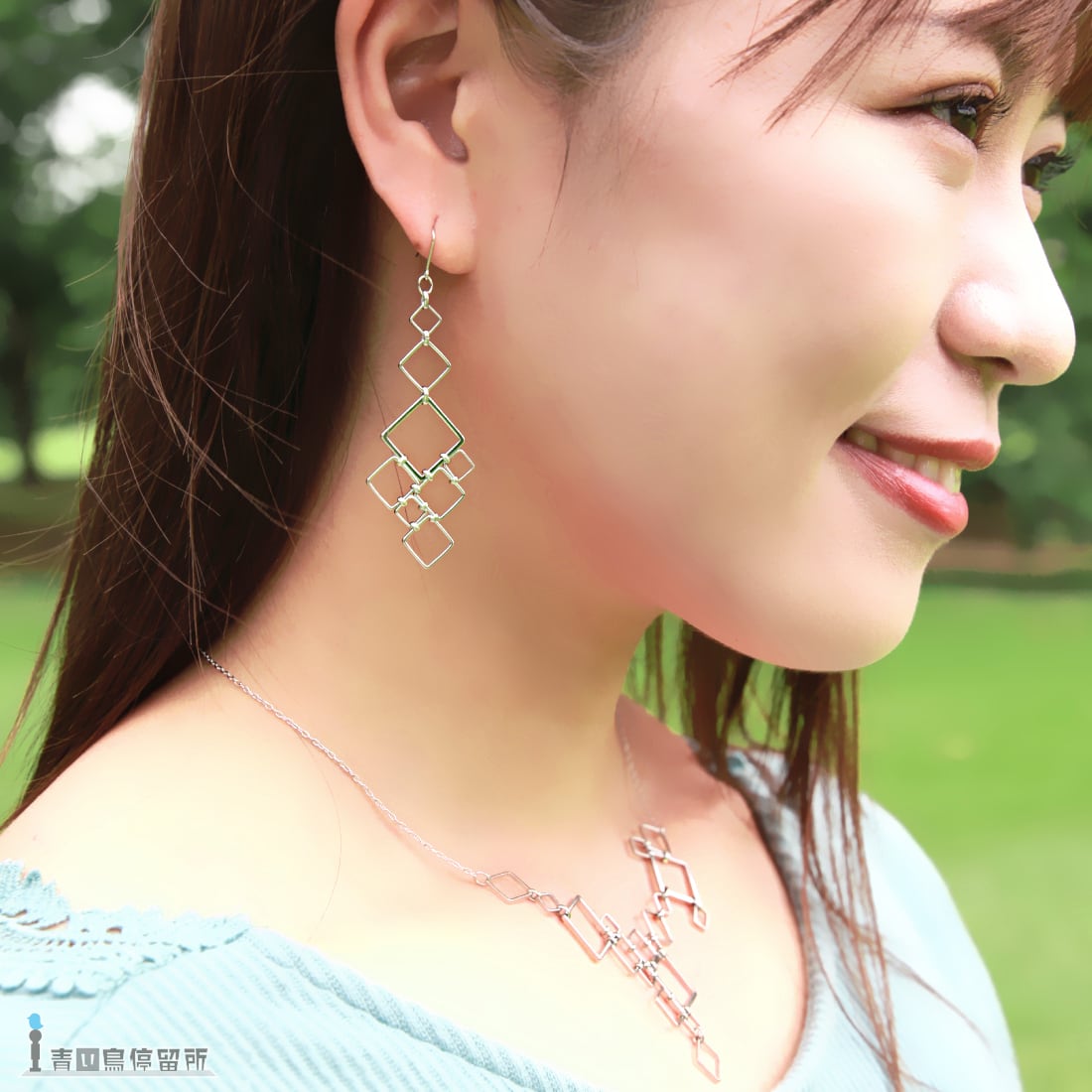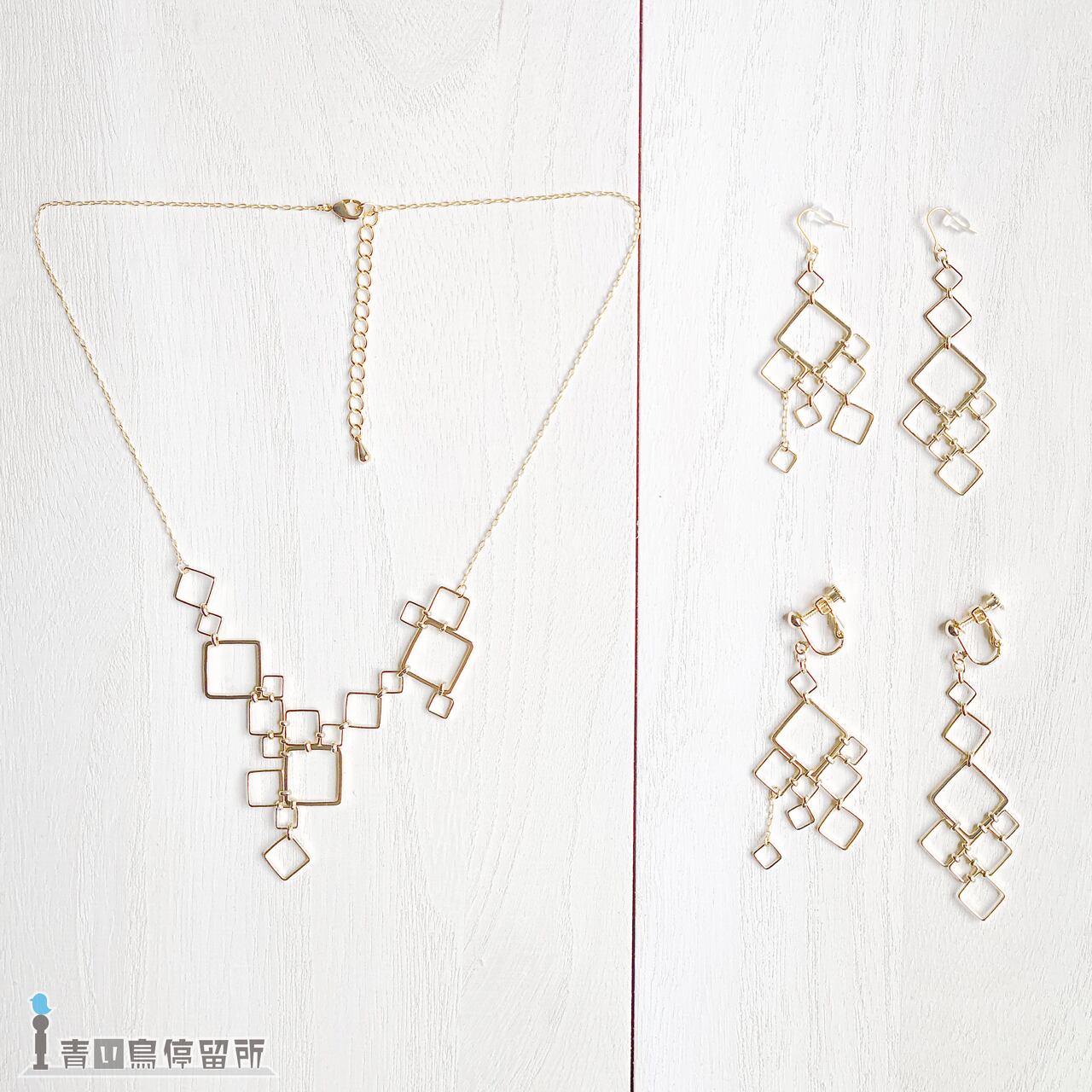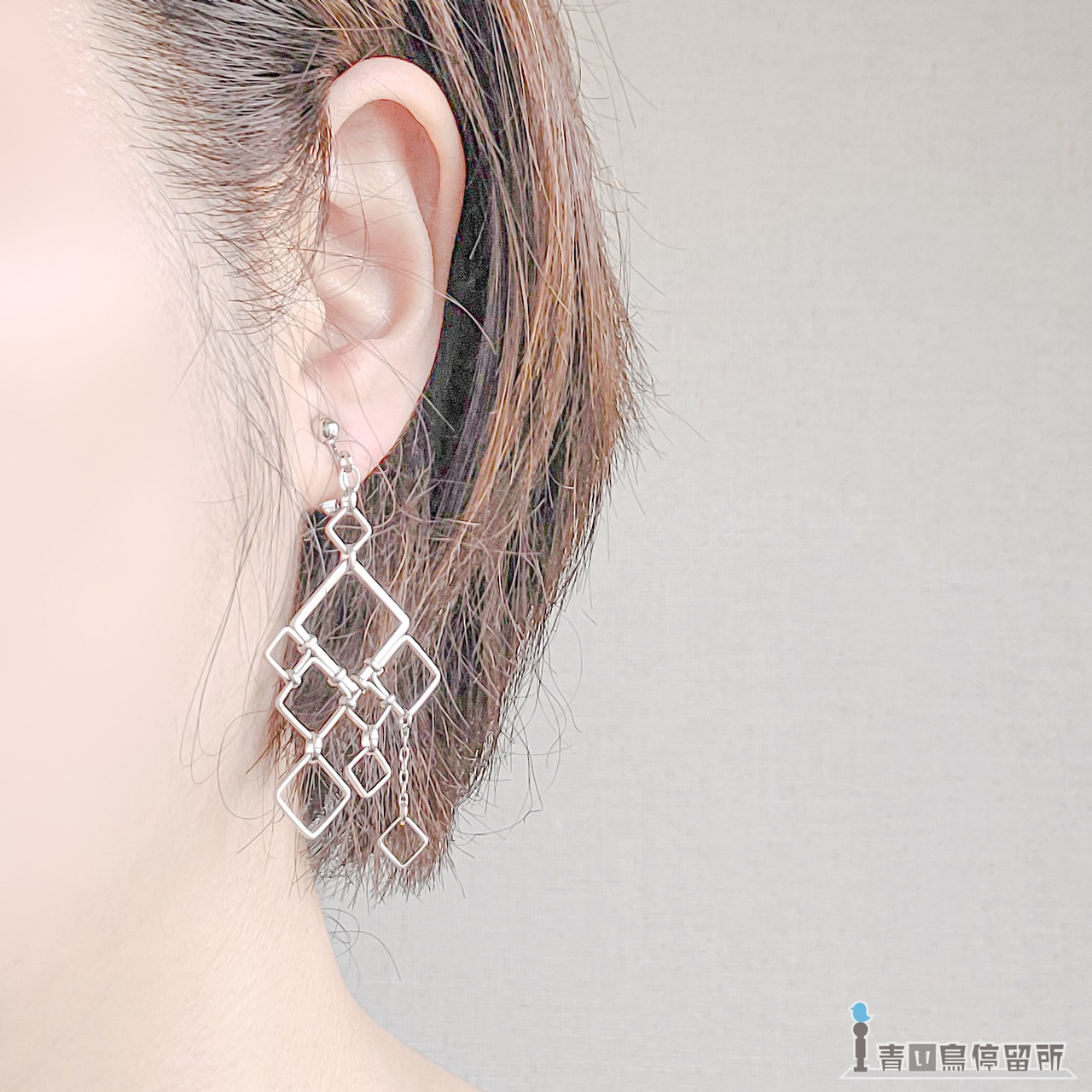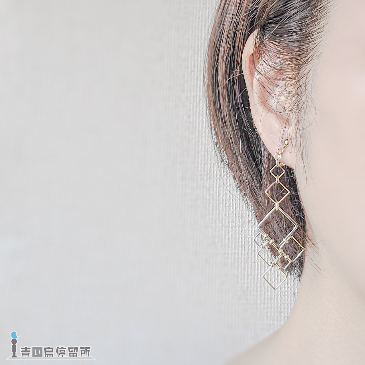 ゆらゆら揺れる大小様々な四角形が形作る、幾何学文様のイヤリングです。