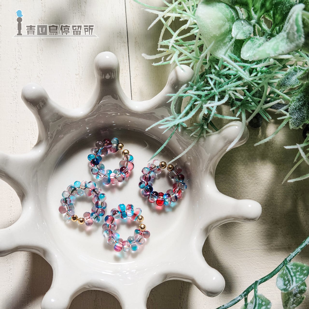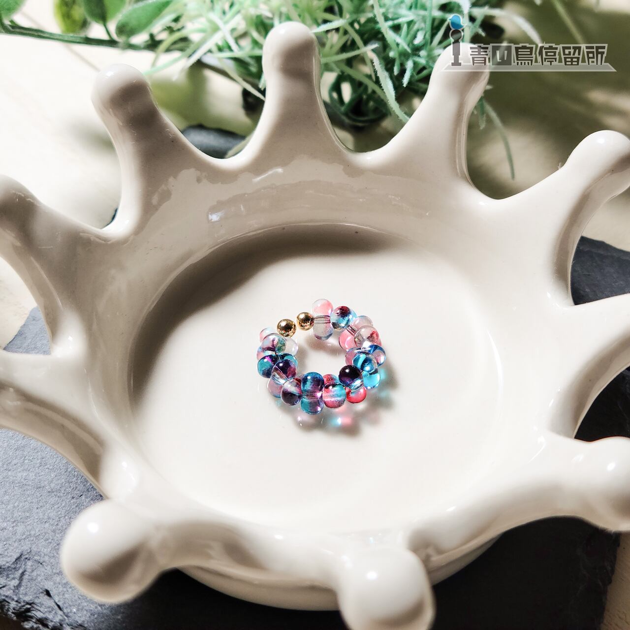 ピンク×ブルーのガラスビーズを集め、つぶつぶした質感のイヤーカフに仕上げました。