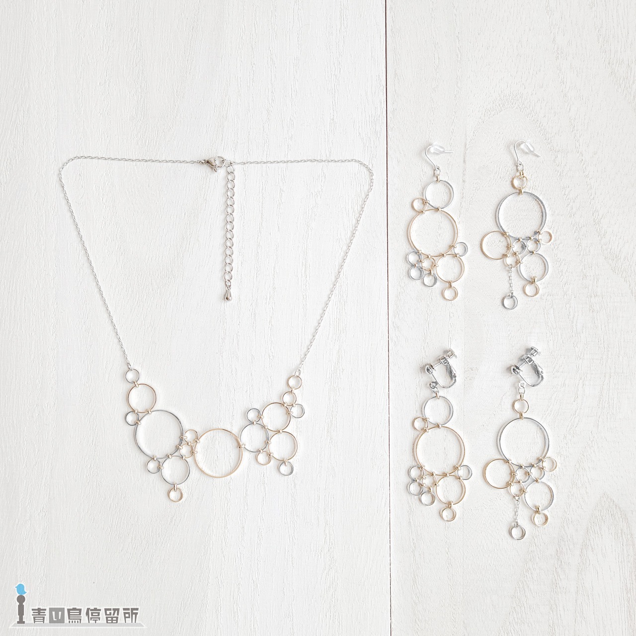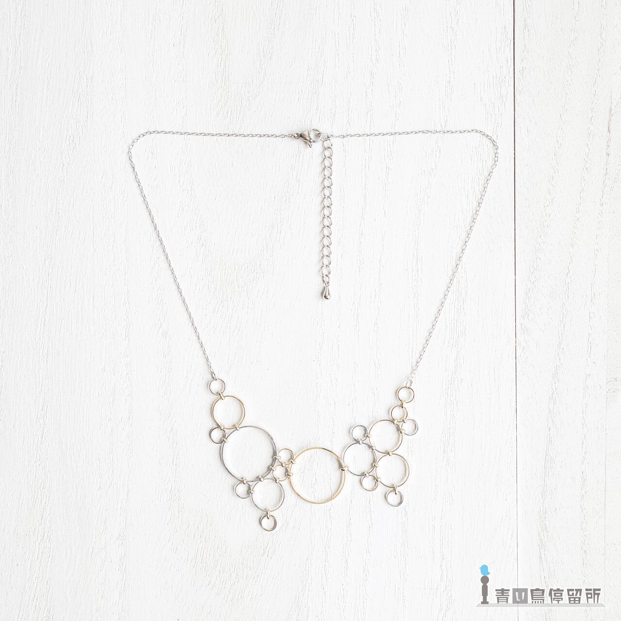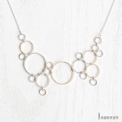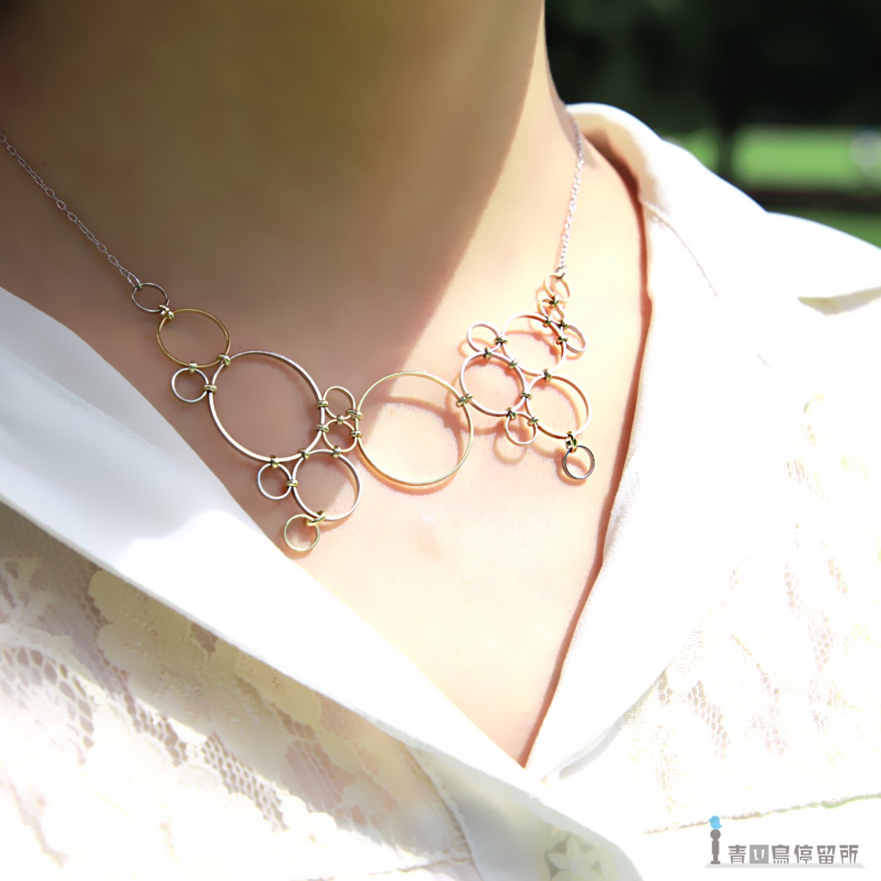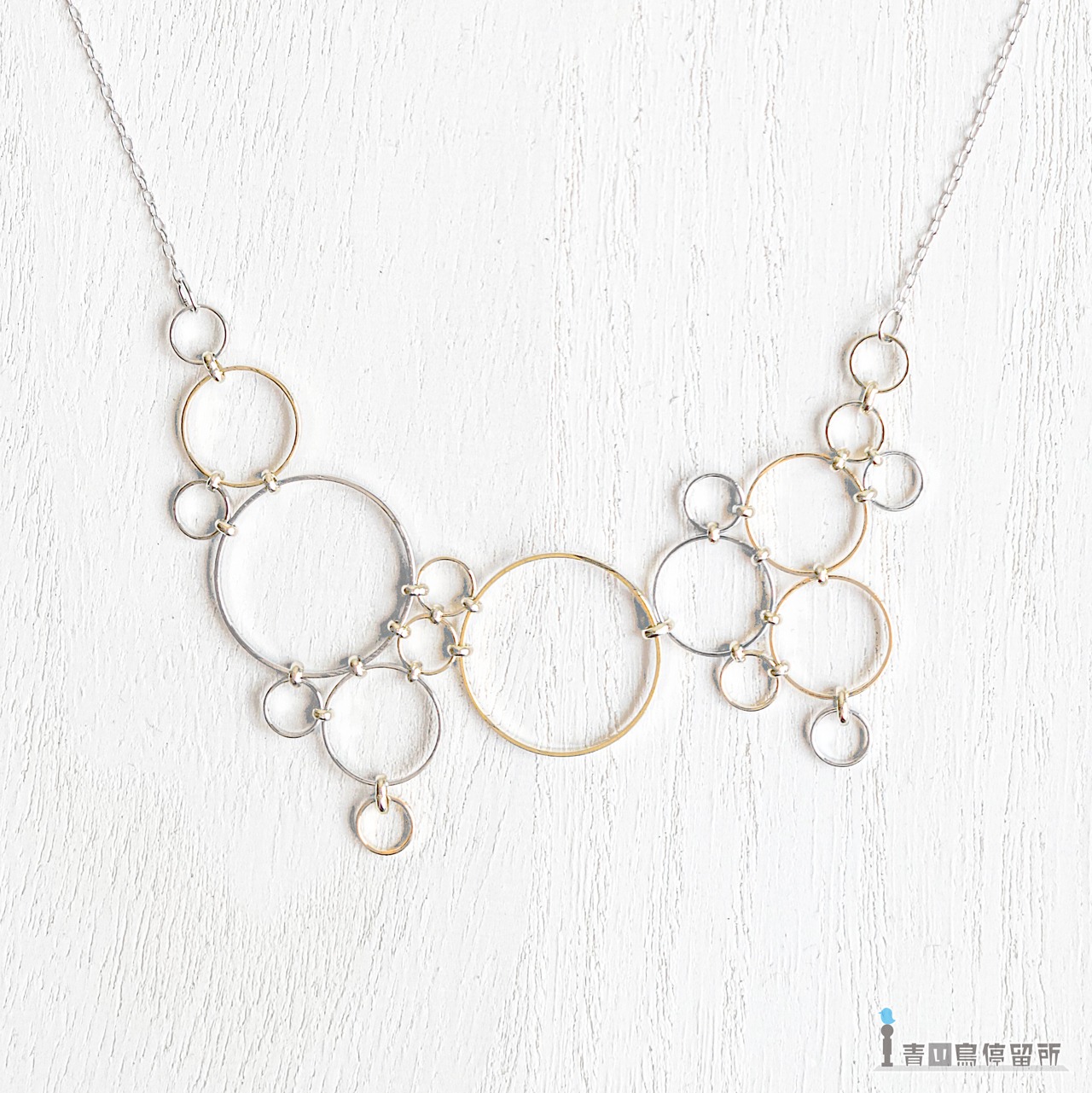 シルバーとゴールドの2色の丸が沢山集まって、幾何学模様を描いたネックレスです。