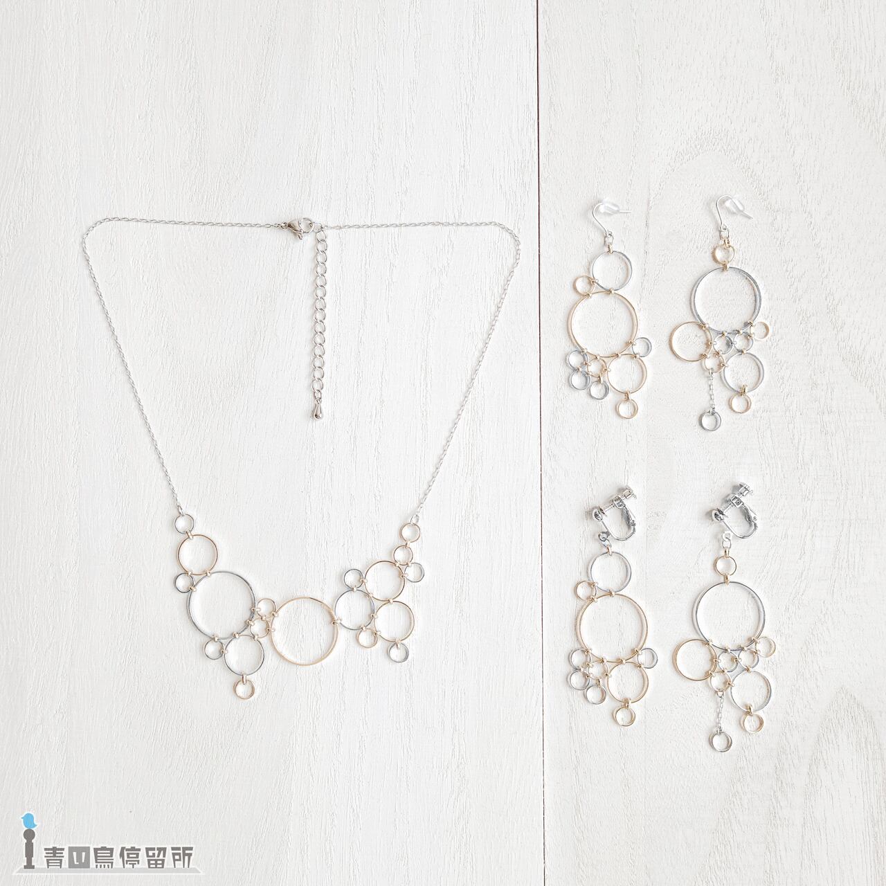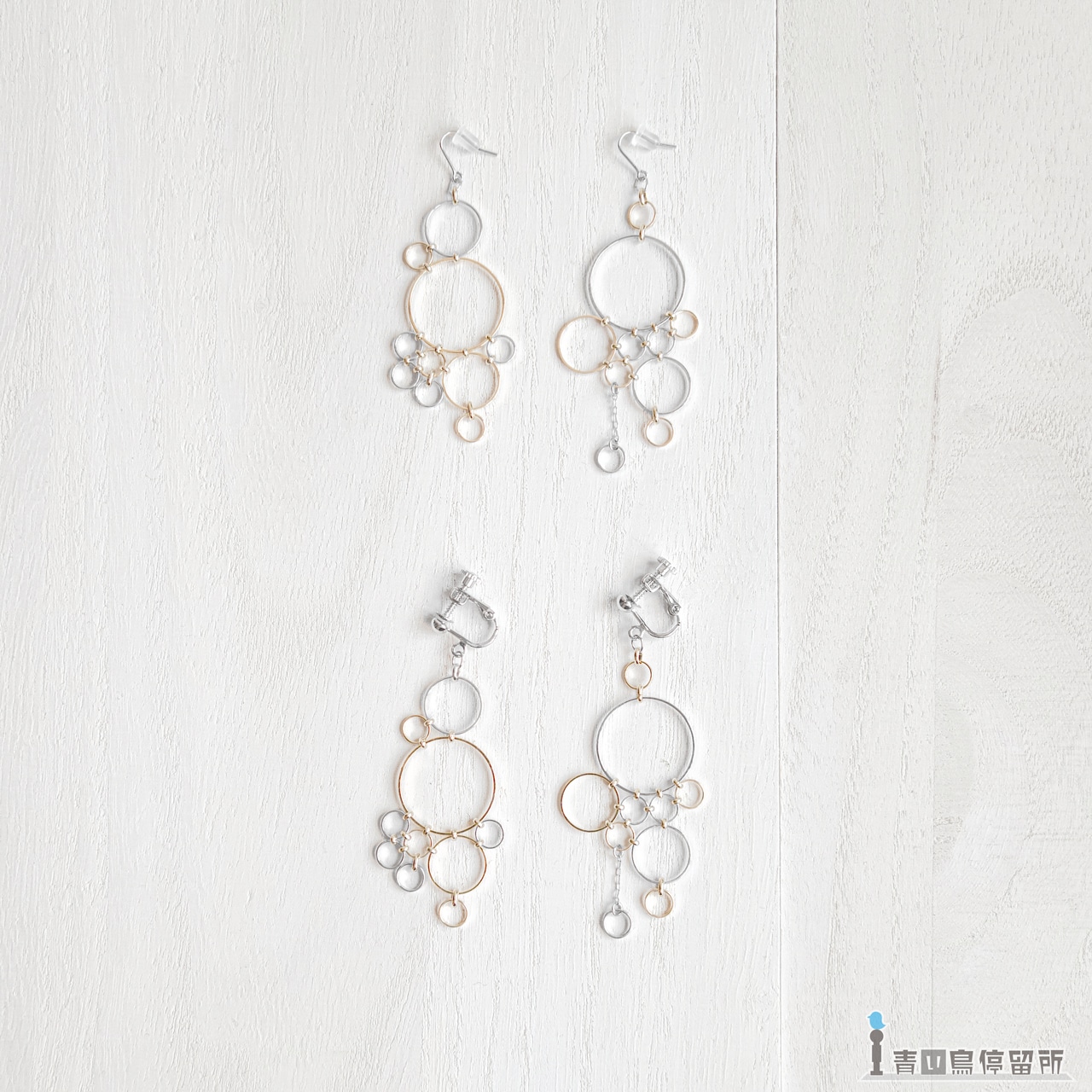 金属チェーン(シルバーカラー)、金属金具(シルバーカラー)、幾何学金具(シルバー/ゴールドカラー)、ピアスキャッチャー(樹脂)